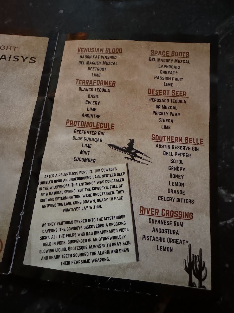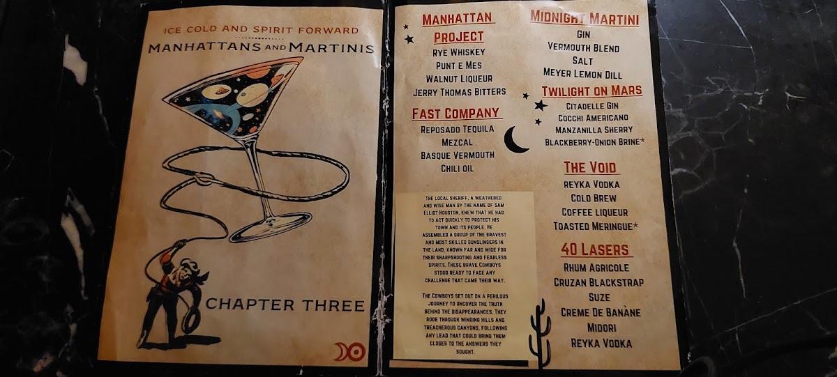 What truly sets Midnight Cowboy apart is its innovative cocktail menu, themed around an imaginative "Cowboys vs. Aliens" narrative. Each drink category, from "Highballs" to "Terraformed Tiki Culture," offers a unique experience. Signature cocktails like the Manhattan Project and Chaps 'N' Spurs showcase exquisite flavors, while exciting presentations and garnishes delight the senses.